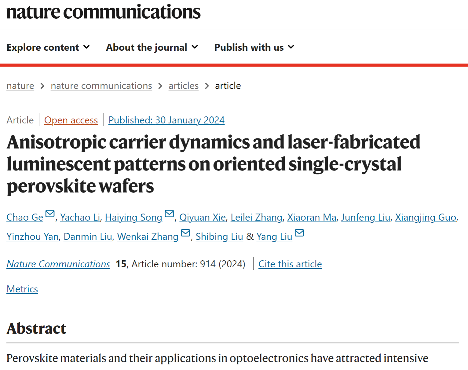2024开门红。近日,365best体育官网登录激光工程研究院固体激光与超快光子学研究所师生在光电功能晶体超快载流子动力学研究方面取得重要进展,相关研究成果以“Anisotropic carrier dynamics and laser fabricated luminescent patterns on oriented single-crystal perovskite wafers”为题,在国际权威期刊《Nature Communications》在线发表(https://doi.org/10.1038/s41467-024-45055-y),研究结果对于推动功能晶体在光电领域的实际应用进程具有重要意义。论文第一完成单位为365亚洲体育网入口,365best体育官网登录助理研究员葛超、博士研究生李亚超为共同第一作者,365亚洲体育网入口葛超助理研究员、宋海英副研究员,北京师范大学张文凯教授和山东大学刘阳教授为共同通讯作者。该研究得到国家自然科学基金和北京市教委科研计划等项目资助。