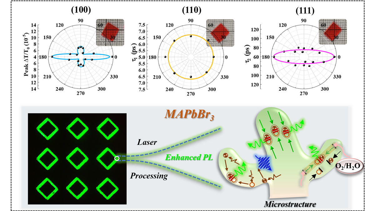 近年来,钙钛矿材料及其在光电子领域的应用引起了广泛关注。然而,对于它们在超快载流子动力学中的各向异性行为的深入理解仍然不足。为弥补这一缺失,研究团队以高质量、不同取向的MAPbBr3单晶晶片为基础,首次在皮秒时间尺度上揭示了光激发载流子在不同取向的晶面内极化以及晶面间的各向异性动力学演变。这一发现从晶体学的角度深入理解了超快载流子的弛豫途径,对于在超快光电子领域,如光调制器、高速光极化传感器和弹道晶体管等方面,探索和拓展钙钛矿单晶的应用具有重要意义。此外,通过采用飞秒激光双光子加工技术,研究团队成功制备了三个数量级荧光增强的发光图案。从多维空间(体块和微/纳米尺度)和时间(稳态和瞬态)的角度深入分析了背后的荧光增强机制,为提高体块晶体的光致发光强度提供了一种方便的自上而下的策略。该研究通过聚焦晶体学角度,对MAPbBr3的超快载流子动力学提供了深刻的理解,期望为今后钙钛矿热载流子在光电子学中的取向选择利用提供更多指导。