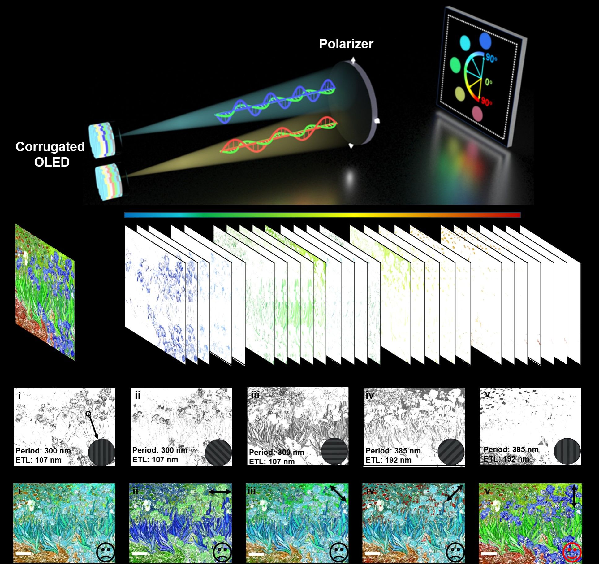近年来,线偏振有机发光二极管已经极大丰富了偏振光学和光电子行业的应用场景;针对三维显示、增强现实/虚拟现实、高密度数据存储和光学加密等,兼顾高偏振、强定向发射、窄带宽、多色可调的线偏振有机发光二极管的低成本和大面积制备,是当前领域内所面临的重要挑战。为解决上述问题,研究团队结合双光束干涉法和真空热蒸镀法,成功实现了兼具低成本和大面积的电介质/金属光栅,率先将金属F-P微腔与光栅微腔耦合到有机发光二极管内部;并借助时域有限差分法,确定了复合微腔的耦合机理,实现了有机发光二极管高强度的天蓝光横电模波导模式和绿色横磁模波导模式的正交出射;通过有效调节光栅周期、有机层厚度等成功将耦合条件覆盖到整个可见光范围,完成全彩偏振显示和图像加密。该工作实现了兼具高偏振消光比、高外量子效率和定向发射的双色正交偏振发射的有机发光二极管。