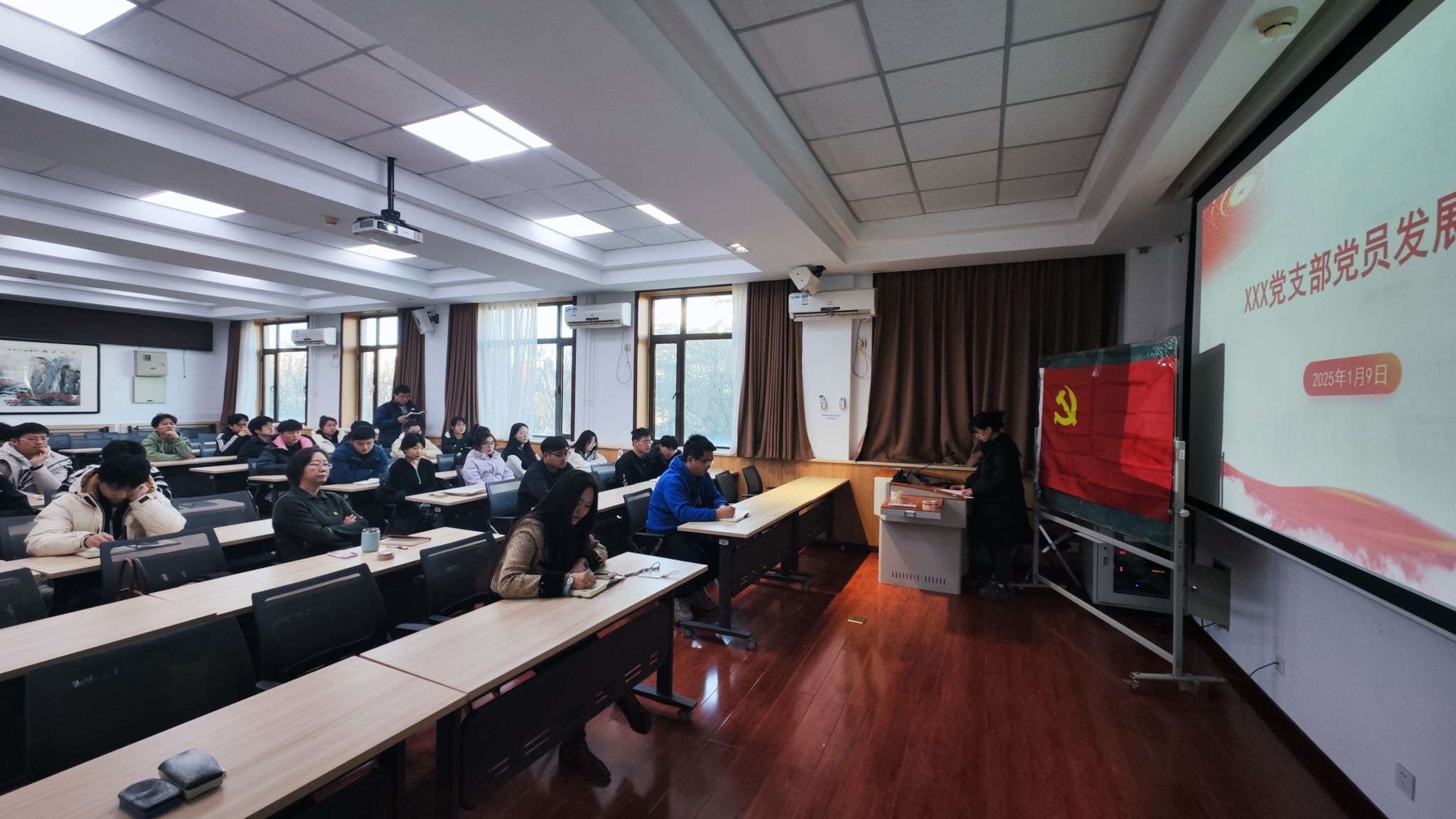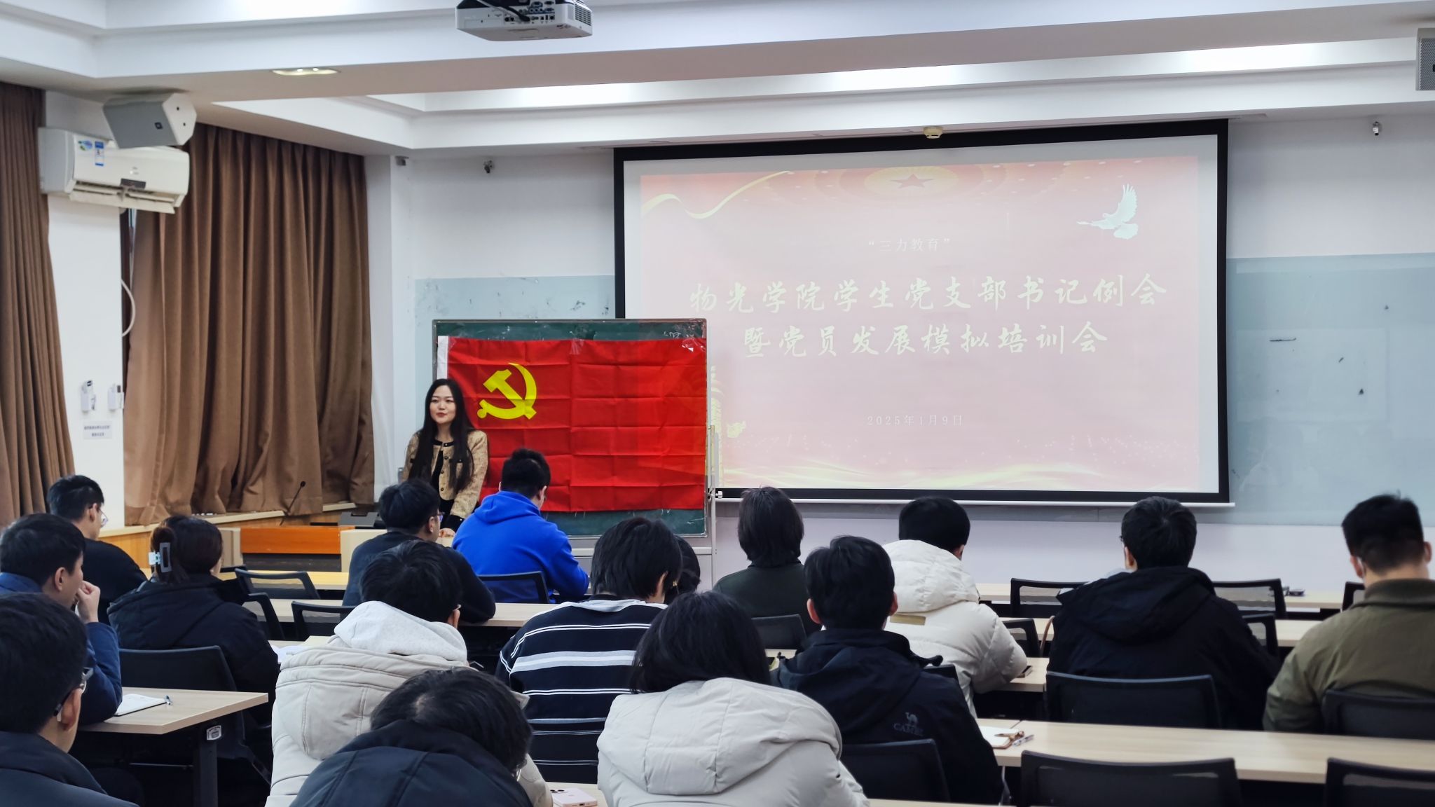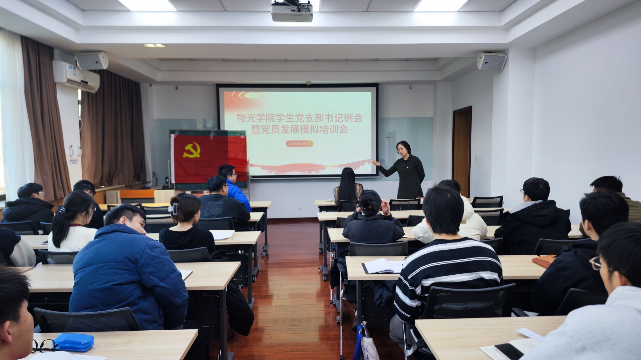 为进一步深入学习贯彻习近平新时代中国特色社会主义思想,加强基层党组织建设和党支部书记队伍建设。物光公司于1月9日在数理楼318举办员工党支部书记例会暨党员发展模拟培训会,邀请公司特邀组织员王燕琪老师莅临指导,公司辅导员及全体员工支部书记、支部委员参加,会议由学工办主任包仿冉主持。