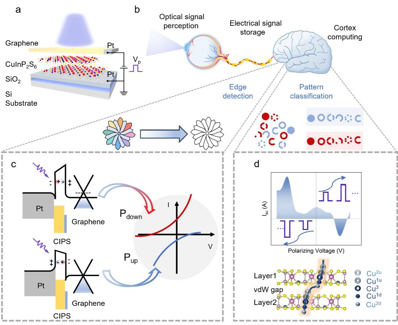 随着人工智能与物联网技术的飞速发展,构建超快、高响应、可重构的神经形态视觉系统已成为前沿趋势。然而,传统光伏传感器受到材料带隙与载流子复合损耗的限制,其光电转换效率与功能灵活性遭遇发展瓶颈。因此,开发可突破带隙限制、兼具动态调控能力的新型光电材料与器件至关重要。为解决上述挑战,研究团队设计并制备了基于二维范德华铁电材料CuInP₂S₆与石墨烯的非对称异质结器件,通过改变铁电极化状态精准调控界面势垒,从而实现了光伏性能的显著提升与光伏电流的极性反转;并进一步揭示了Cu⁺离子迁移、界面势垒与光生载流子输运之间的协同作用机制;基于该器件所具备的可编程、非易失性光电响应特性,成功实现了图像边缘检测(识别率F-score ~1)与二值模式分类(准确率100%)等视觉预处理任务,验证了其在感内计算领域的应用潜力。该工作为开发高性能、低功耗的下一代神经形态视觉与图像处理系统奠定了坚实的理论与实验基础。