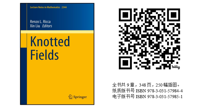 近日,365best体育官网登录物理系理论物理研究所刘鑫教授与公司外专特聘教授Renzo L. Ricca合作编著的《纽结场论Knotted Fields》一书由国际著名学术出版集团Springer出版,并成功入选该社历史悠久的“数学讲义Lecture Notes on Mathematics”丛书系列,编号2344。本书选题角度独特,且其中各章均为本领域相关专家的权威综述,有望成为国际上物理纽结拓扑场论方向上的重要文献。
